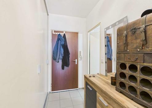Die Wohnung verfügt über einen funktionalen Grundriss. Der Eingangsbereich ist mit einem Einbauschrank ausgestattet und bietet praktischen Stauraum. Das Badezimmer ist klassisch gestaltet und mit einer Badewanne versehen.