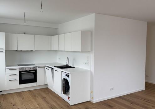 Die offene Wohnküche ist das Herz der Wohnung – mit einer hochwertigen Einbauküche und Markengeräten, die Lust aufs Kochen machen. Großzügige Fenster tauchen die Räume in Tageslicht und schaffen eine warme, freundliche Atmosphäre.