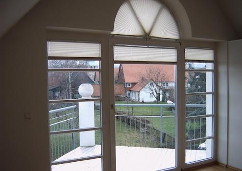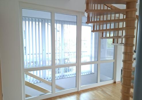 Die 2 Südfenster erhalten jeweils einen Sonnenschutz 127mm Lamellenvorhang in hellgrau.