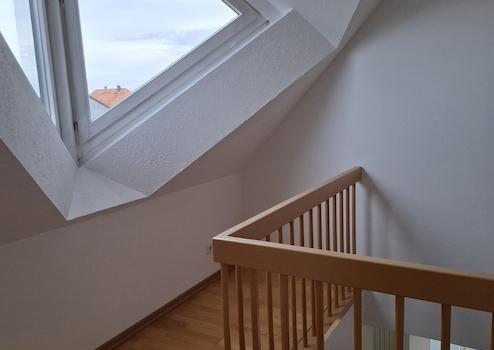 Architekten Reihenendhaus auf der Sonnenseite mit 130m² Wohnfläche und ca. 100m² Front-und Seitenfläche auf einem 1400m² Grundstück. 2025/26 renoviert und optimiert verfügt über eine gehobene Innenausstattung. Im Ergeschoß befinden sich die Garage und Hauswirtschafts-Abstellraum. Im 1.OG amerik. Küche mit Ess-, Wohnbereich in der Summe ca. 55m² mit Bucheparkett Schiffsboden, Garderobenschrank, freistehende XXL Voll-Holzspindeltreppe zum DG, Südfensterfront im Dreieckformat, Windergartenstil, Boden-Deckenverglasung mit Doppelfügeltür, davor umlaufender frei schwebender Balkongittersteg, im Dachgeschoß Treppenausgang mit Fenster-Platz für kl. Homeoffice, 2 Schlafzimmer, Badezimmer mit 2 Dachfenstern und raumprägender Verspiegelung hohe Decken mit LED Leuchten, dreieckige Dachterasse vor Bogenfenster mit Glastür, der umgebende Rosengarten wird vom Eigentümer gepflegt und unterhalten