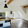 • Offener Wohn- und Küchenbereich mit Sichtbalken in Holzoptik