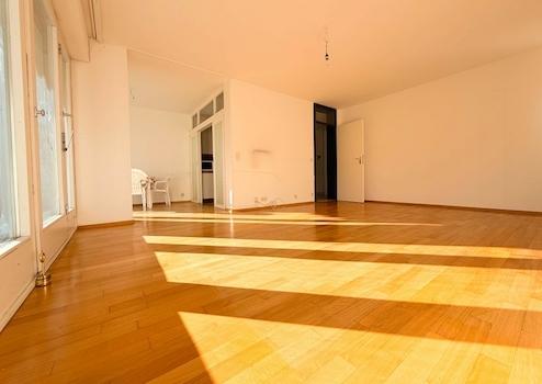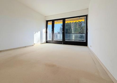 Die sehr helle Wohnung besticht mit durchgehend raumhohen Panoramafenstern mit Blick ins Grüne. Modernisierungsmaßnahmen stehen in der Wohnung an.