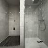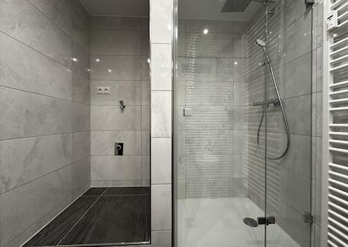 Gegenüber liegt das modern ausgestattete Badezimmer mit ebenerdiger Dusche. Ein besonderes Highlight ist die hochwertige Regendusche. Zusätzlich verfügt das Badezimmer über eine großzügige Nische mit Platz für Waschmaschine und Trockner.