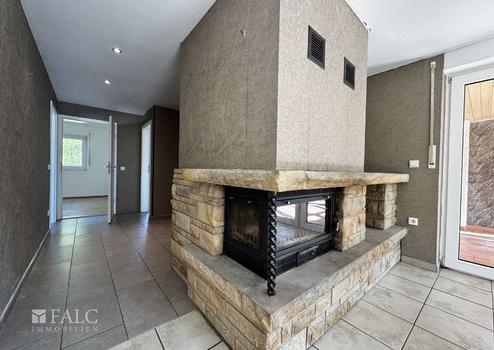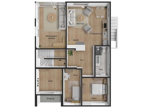 Beim Betreten dieser Wohnung empfängt Sie ein großzügiger Flur, der in die verschiedenen Räume führt. Das Herzstück ist das lichtdurchflutete Wohnzimmer mit seinem beeindruckenden Kamin, der nicht nur an kalten Tagen für eine wohlige Atmosphäre sorgt, sondern auch ein echter Hingucker ist. Große Fenster lassen viel Tageslicht herein und schaffen eine freundliche Wohnatmosphäre. Von hier aus gelangen Sie in den angrenzenden Wintergarten, ein gemütlicher Ort für entspannte Stunden mit Blick in den liebevoll angelegten Garten.