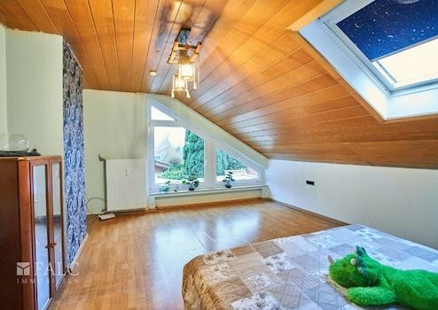 Über eine massive breite Treppe gelangen Sie in die zweite Wohneinheit, die sich über das gesamte Obergeschoss und das ausgebaute Dachgeschoss erstreckt. Schon beim Betreten fällt die Helligkeit der Räume auf. Der Flur mit direktem Zugang zur Loggia (mit Sonnenschutz-Markise) bietet einen herrlichen Blick in den Garten. Auf der gegenüberliegenden Seite befindet sich das Wohnzimmer, welches von den Mietern aktuell jedoch als Schlafzimmer genutzt wird, mit Zugang zur zweiten Loggia, die zur Straßenseite ausgerichtet ist – ideal, um die Morgensonne mit einer Tasse Kaffee zu begrüßen.