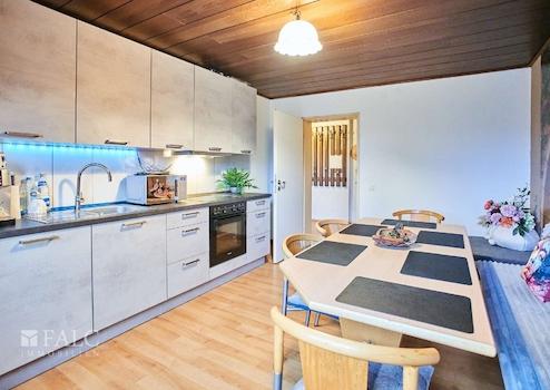 Die offene Küche bietet viel Platz und ist funktional gestaltet. An der Einbauküche lassen sich kulinarische Köstlichkeiten zubereiten, während der angrenzende Wohnbereich Platz für gemeinsame Mahlzeiten bietet. Zwei geräumige Schlafzimmer bieten vielfältige Nutzungsmöglichkeiten – ob als Elternschlafzimmer, Kinderzimmer oder Büro. Das Badezimmer mit großem Tageslicht-Fenster überzeugt mit einer Kombination aus Dusche und Badewanne und lädt zum Entspannen ein.