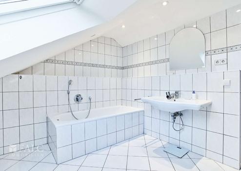 Über eine offene Treppe gelangen Sie in das ausgebaute Dachgeschoss, das zusätzliche Wohnfläche bietet. Hier finden Sie ein großes Schlafzimmer, ein geräumiges Badezimmer mit Tageslicht sowie einen kleinen Raum, der sich ideal als Ankleideraum oder als Homeoffice eignet.