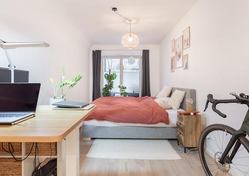 Das Schlafzimmer überzeugt durch seine ruhige Lage und bietet genügend Raum für einen großen Kleiderschrank sowie ein komfortables Bett. Das Badezimmer ist modern gestaltet und verfügt über eine Badewanne mit Duschmöglichkeit.