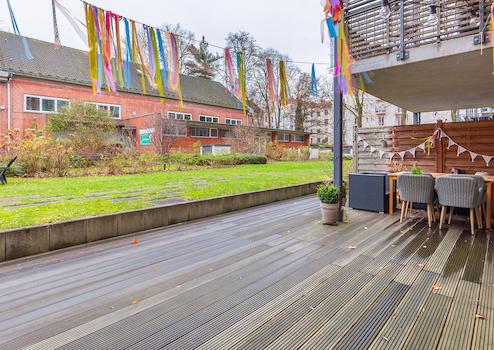 Ein besonderes Highlight der Wohnung ist die großzügige Terrasse, die zum Entspannen und Verweilen einlädt. Diese wurde 2024 komplett saniert und besticht mit einer Gesamtgröße von ca. 43 m². Der gepflegte Gemeinschaftsgarten bietet zusätzlichen Raum für Erholung im Freien.