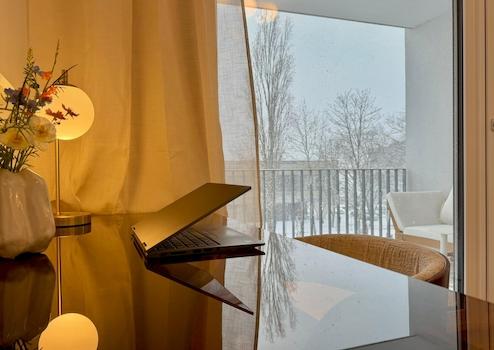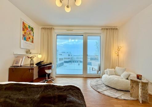Das 1. Zimmer rechts umfasst 22,30 m² Sondermietfläche sowie 12,9 m² anteilige Mietfläche an der Gemeinschaftsfläche. Das Zimmer besticht durch seine Helligkeit. Bodentiefe Fenster verbinden das großzügige Schlafzimmer über eine Terrassentür mit dem exklusiven Balkon über 8,6 m². Geöffnet zu zwei Seiten und überdacht lädt dieser zum Ausklingen warmer Sommerabende ein oder zu einem kurzen Kaffee in der Mittagszeit. Die Einrichtung ist sehr flächeneffizient gestaltet, sodass sich samt des bestehenden Inventars ein großzügiges Raumgefühl ergibt. Abgerundet wird das Wohnerlebnis durch die weitreichende Aussicht in den begrünten Hinterhof mit Spielplatz.