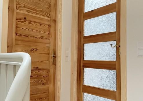 Historische Elemente wie sämtliche originalen alten Türen wurden vollständig erhalten und fachgerecht aufgearbeitet. Sie prägen den authentischen Charakter des Hauses und stehen bewusst im Kontrast zur vollständig erneuerten technischen Infrastruktur.