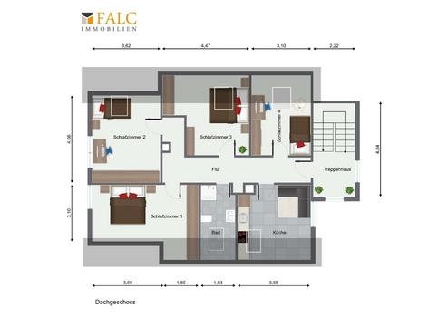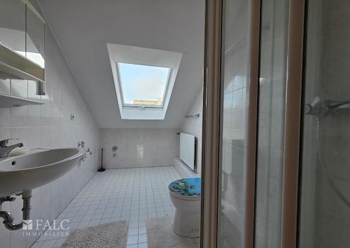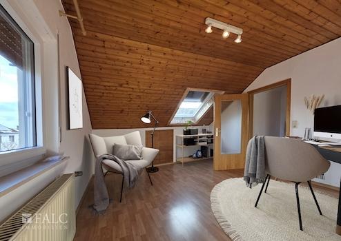 Über das gemeinsame Treppenhaus gelangen Sie in das Dachgeschoss, das 1987 angebaut wurde. Hier befinden sich vier weitere Zimmer, ein helles Tageslicht-Duschbad sowie eine großzügige Küche mit einer Küchenzeile – diese Ebene eignet sich ideal als separate Wohneinheit oder für größere Familienstrukturen.