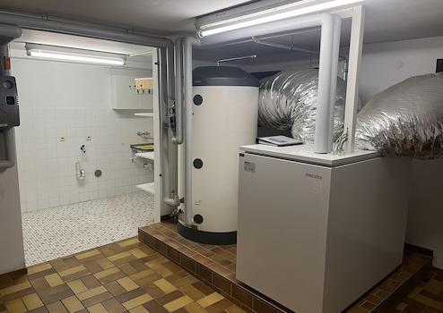 Die Beheizung erfolgt über eine Wärmepumpe in Kombination mit Fußbodenheizung; ergänzend sorgen zwei Kachelöfen für behagliche Wärme.