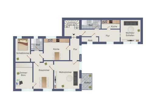 Die Wohneinheit im Obergeschoss (ca. 83 m²) verfügt ebenfalls über eine eigene Küche, Wohn- und Essräume, zwei Schlafzimmer sowie ein Badezimmer und einen Balkon. Durch die klare Grundrissstruktur sind individuelle Modernisierungen gut umsetzbar.