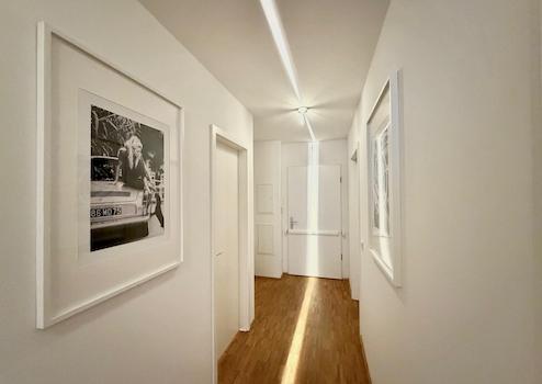 Beim Betreten der Wohnung eröffnet sich ein großzügiger, offen gestalteter Flur. Direkt vorne rechts befindet sich eine Garderobe mit ausreichend Platz für Jacken, Schuhe und Alltagsutensilien. Auf der linken Seite liegt das erste WG-Zimmer. Direkt gegenüber befindet sich das separate Gäste-WC – ein klarer Vorteil im WG-Alltag und bei Besuch. Weiter den Flur entlang befindet sich links das zweite WG-Zimmer. Gegenüber davon liegt das große Badezimmer mit Duschwanne und multifunktionalem Waschtrockner.
