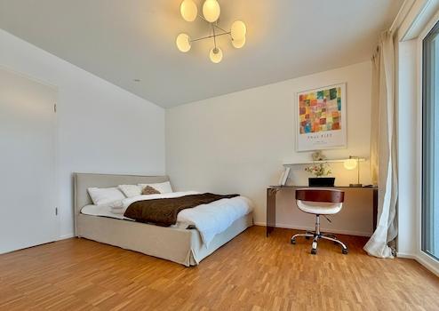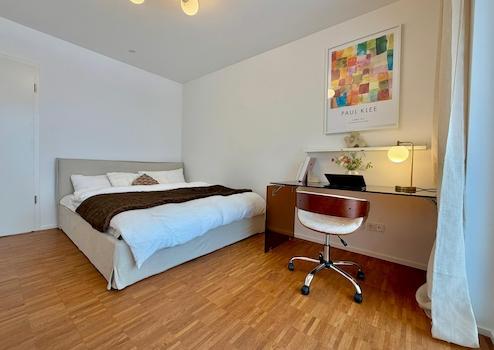 Das 1. Zimmer rechts umfasst 22,30 m² Sondermietfläche sowie 12,9 m² anteilige Mietfläche an der Gemeinschaftsfläche. Das Zimmer besticht durch seine Helligkeit. Bodentiefe Fenster verbinden das großzügige Schlafzimmer über eine Terrassentür mit dem exklusiven Balkon über 8,6 m². Geöffnet zu zwei Seiten und überdacht lädt dieser zum Ausklingen warmer Sommerabende ein oder zu einem kurzen Kaffee in der Mittagszeit. Die Einrichtung ist sehr flächeneffizient gestaltet, sodass sich samt des bestehenden Inventars ein großzügiges Raumgefühl ergibt. Abgerundet wird das Wohnerlebnis durch die weitreichende Aussicht in den begrünten Hinterhof mit Spielplatz.