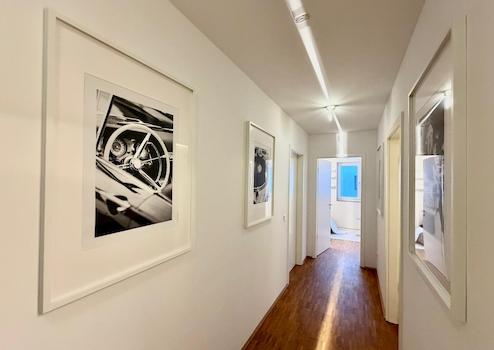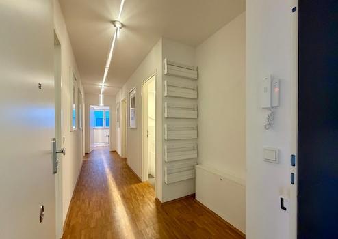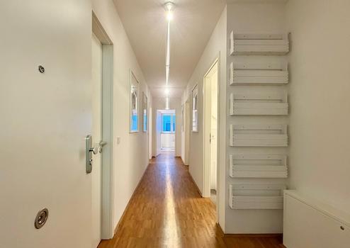 Beim Betreten der Wohnung eröffnet sich ein großzügiger, offen gestalteter Flur. Direkt vorne rechts befindet sich eine Garderobe mit ausreichend Platz für Jacken, Schuhe und Alltagsutensilien. Auf der linken Seite liegt das erste WG-Zimmer. Direkt gegenüber befindet sich das separate Gäste-WC – ein klarer Vorteil im WG-Alltag und bei Besuch. Weiter den Flur entlang befindet sich links das zweite WG-Zimmer. Gegenüber davon liegt das große Badezimmer mit Duschwanne und multifunktionalem Waschtrockner.