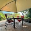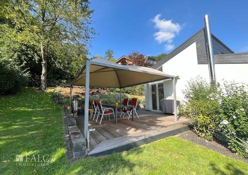 Große Fensterflächen und Dachoberlichter sorgen für viel Tageslicht und ein angenehmes Raumklima. Im Außenbereich laden eine überdachte Terrasse mit Bankireiholz, eine kleine weitere Sitzgelegenheit und ein top gepflegter und pflegeleichter Garten zum entspannten Aufenthalt ein.