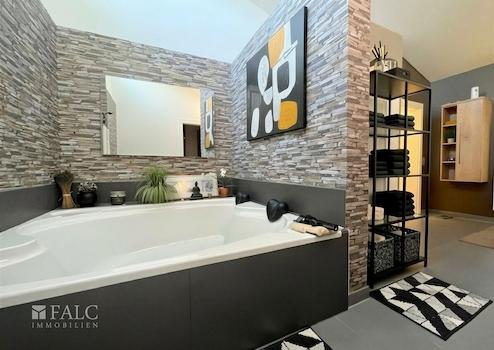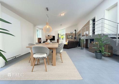 Dieses Haus aus dem Baujahr 1995 präsentiert sich mit einem gepflegten, modernen Ausstattungsniveau und bietet auf ca. 185 m² Wohnfläche ein komfortables Wohngefühl. Der großzügige Wohn und Essbereich ist offen mit der Küche verbunden und wird durch großformatige, graue Bodenfliesen geprägt, die dem Raum eine ruhige, klare Linie geben. Ein Kaminofen ergänzt den Wohnbereich als stimmungsvolles Komfortelement.