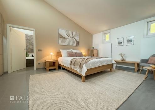 Die Küche ist mit einer modernen Einbauküche mit Kochinsel ausgestattet. Das Schlafzimmer verfügt über ein Bad en suite mit großer Eckbadewanne, separater Dusche und zeitloser Gestaltung. Eine Klimaanlage sorgt auch im Hochsommer für angenehme Temperaturen.