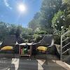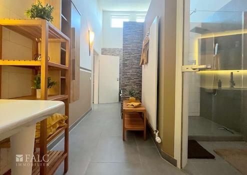 Über eine Metalltreppe im Industrielook ist das erste klimatisierte Schlafzimmer zu erreichen. Dieses bietet zudem Zugang zu dem Wellnessbereich mit separatem WC. Über eine weitere Metalltreppe gelangen Sie vom Wohnzimmer aus in ein Durchgangszimmer, welches zurzeit als Büro genutzt wird. Von hieraus gelangen Sie zu einem zweiten Badezimmer, ebenso in das Jugendzimmer. Hier könnte auch wieder ein einziges großes Zimmer entstehen, da die Trennung nur durch eine Leichtbauwand erfolgte. Letzteres bietet einen weiteren Zugang zum großen und pflegeleichten Garten. Eine sehr schön angelegte Terrasse mit Pavillon runden das perfekte Bild des einzigartigen Hauses ab.