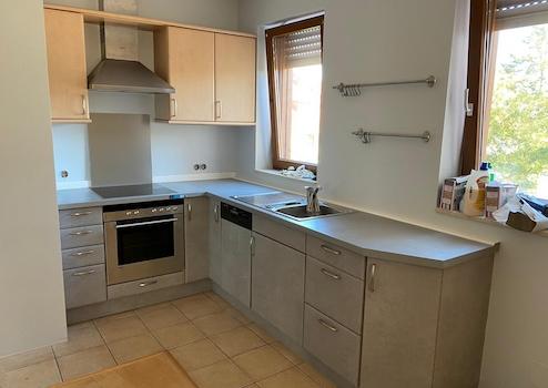 Die Einbauküche ist mit neuen Geräten ausgestattet. Gefrier-Kühlkombination, Ceranherd, GSP. Moderne Tresenelemente können den derzeit klassischen L-Grundriss noch modisch ergänzen.