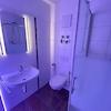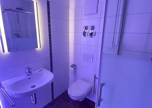 - Badezimmer mit Dusche mit Glasduschkabine, WC und Waschbecken (LED-Farblich änderbar)