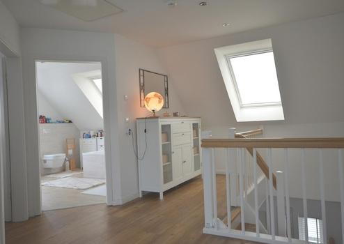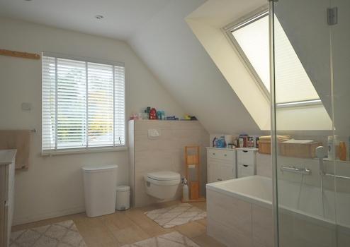 Eine Gas-Zentral-Heizung erwärmt das Haus über eine Fußbodenheizung in jeder Etage und in jedem Raum. Die 3-fach verglasten Fenster bieten viel Schutz vor Kälte und dennoch sind alle Zimmer aufgrund der Größe der Fenster lichtdurchflutet. Drei zusätzliche Veluxfenster mit elektrischen Außenrollläden bringen ebenso sehr viel Licht in das obere Geschoss.