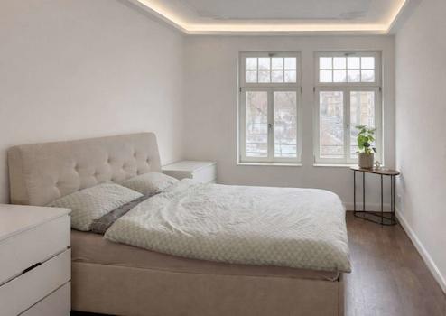 Abgerundet wird das Wohnkonzept durch Echtholzparkett, Fußbodenheizung und edle Stuckelemente sowie die abgehängten Decken mit indirekter Beleuchtung. Die Wohnung verbindet stilvoll den Charakter eines sanierten Altbaus mit exklusiven Wohnkomfort.