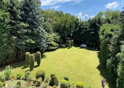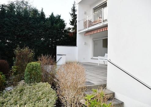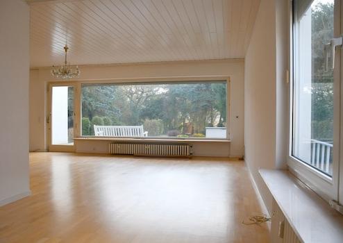 Auch die Wohnung im Obergeschoss überzeugt durch Großzügigkeit und Helligkeit. Über eine geschmackvolle Diele gelangt man in den repräsentativen Wohn- und Essbereich mit Zugang zum Sonnenbalkon. Von hier aus eröffnet sich ein schöner Blick in den eingewachsenen Garten. Große Fensterfronten sorgen für viel Tageslicht und ein angenehmes, offenes Raumgefühl.
