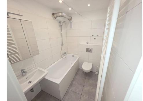• Bad: Modern mit Geberit-Unterputzsystem, Handtuchheizkörper sowie Badewanne mit Duschfunktion und pflegeleichten Fliesen.