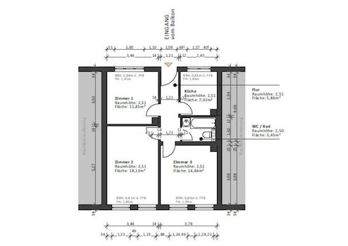 Zi 1: 11,85 m² | Zi 2: 18,13 m² | Zi 3: 14,86 m² | Küche: 7,02 m² | Bad: 3,45 m² | Flur: 5,86 m²