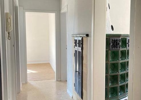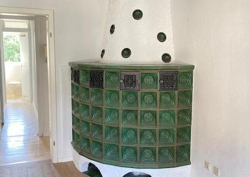 Beheizt wird diese helle Wohnung mit einem großen Kachelofen. Warmwasser im Bad wird durch einen Durchlauferhitzer bereitgestellt.
