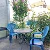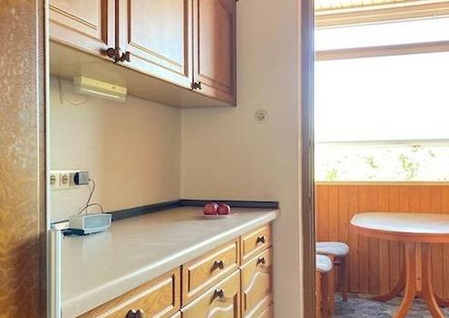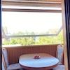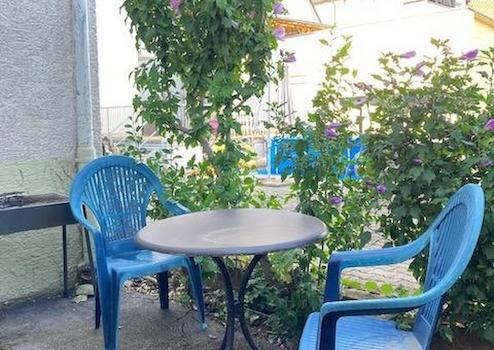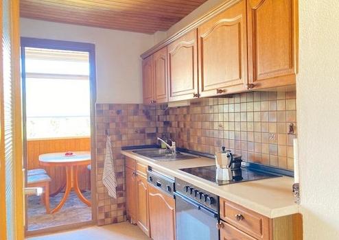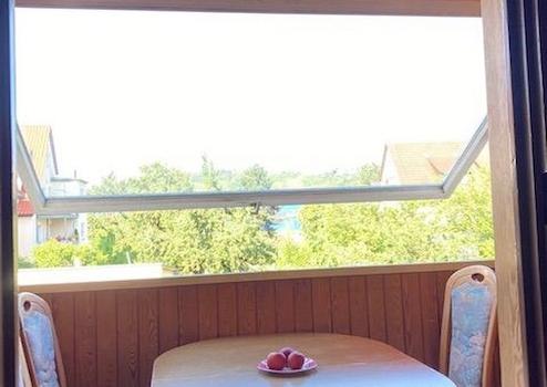 Direkt an die Küche grenzt eine Loggia/Balkon mit einem großem Fenster sowie schönem Blick in die Weinberge. Hier steht ein Esstisch mit Stühlen der Platz für alle bietet.