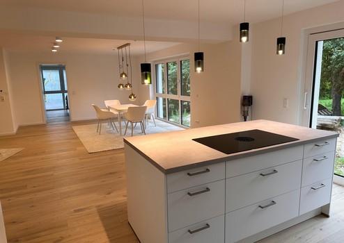 Zur hochwertigen Ausstattung gehört außerdem eine moderne Einbauküche mit Kücheninsel, ausgestattet mit einem BORA X Pure Kochfeld.