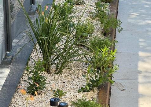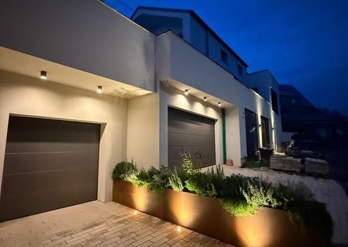 - Terrasse mit hochwertigem Belag, Milchglasgeländer, Stromanschluss und integrierter Beleuchtung. Professionell gestaltet durch einen renommierten Landschaftsgärtner, mit Cortenstahl-Beet und stimmungsvoller Außenbeleuchtung.