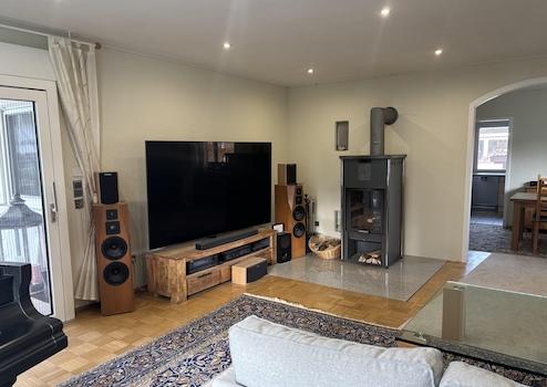 - Geräumiges Wohnzimmer mit Parkett und 10Kwh Holzofen. Direkter Zugang zur großzügigen, teilweise überdachten Terrasse