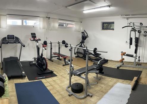 - großer gefliester Fitnessraum mit Infrarotdeckenstrahler als Heizung