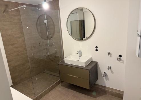 Das Badezimmer hat eine großzügige Walk-in-Dusche mit Glasabtrennung, moderne Armaturen, großformatige Fliesen und ein stilvoller Waschtisch mit Rundspiegel schaffen einen hochwertigen, zeitgemäßen Look.