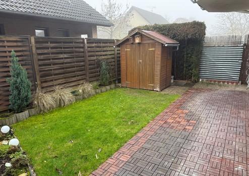 Die Küche und Wohnbereiche bieten flexible Gestaltungsmöglichkeiten und eignen sich ideal für individuelle Einrichtungskonzepte. Mehrere Räume öffnen sich zum gepflegten Garten, der mit Rasenfläche, Zierpflanzen, Sichtschutzelementen und einem praktischen Gartenhaus überzeugt. Der Außenbereich bietet viel Privatsphäre und eignet sich perfekt für entspannte Stunden im Freien.