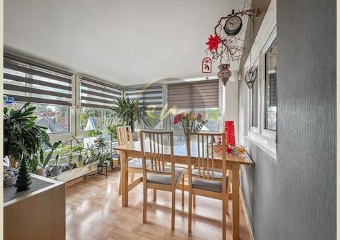 Das Herzstück dieser Wohnung bildet das großzügige Wohnzimmer, das dank seiner offenen Gestaltung für eine freundliche und einladende Wohnatmosphäre sorgt. Direkt vom Wohnzimmer aus gelangt man in einen der beiden Wintergärten, der aktuell als Essbereich genutzt wird.