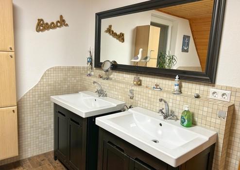 Im Bad ist ein schöner Linoleumboden verlegt – pflegeleicht und passend zum Stil.