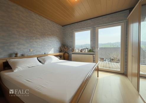 -Wohn- und Schlafzimmer mit großer Fensterfront zum Balkon – lichtdurchflutete Räume