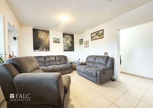 Von der Diele gelangen Sie in das helle Wohnzimmer mit großen Fensterfronten, die den Raum in warmes Tageslicht tauchen. Hier entsteht ein idealer Ort für entspannte Stunden mit der Familie. Der direkte Zugang zum großzügigen Balkon eröffnet einen herrlichen Blick in den liebevoll angelegten Garten.