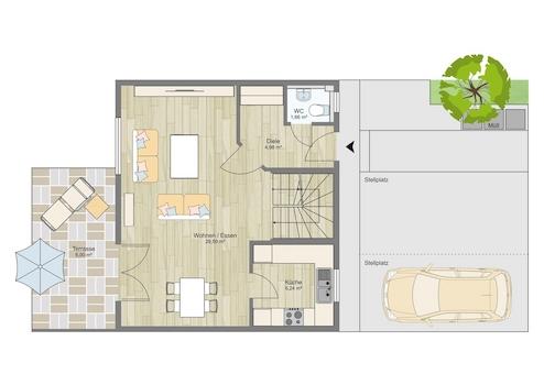 Im Erdgeschoss befinden sich die Küche, ein Gäste-WC und der Wohn-Essbereich. Von hier aus gelangen Sie auf eine große überdachte Terrasse und in den kleinen, gut gepflegten Garten des Objektes.