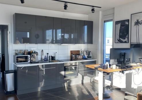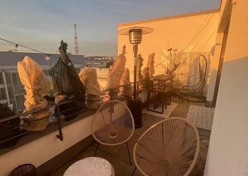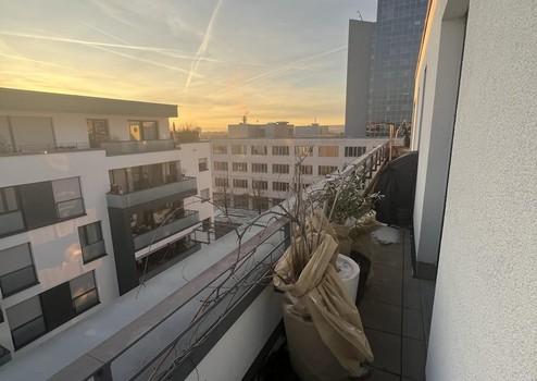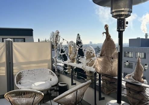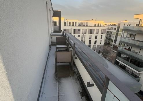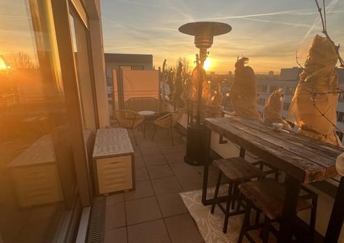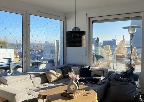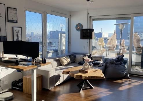Lichtdurchflutete Penthousewohnung mit 2,5 Zimmer, bodentiefen Fenstern, Fußbodenheizung, 3 seitiger Dachterasse, teilmöbliert (nach Absprache) für bis zu 24 Monate zu vermieten.