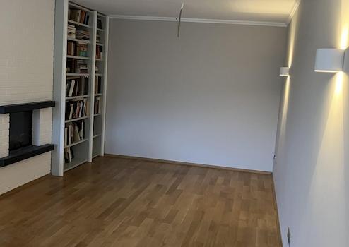 Highlight ist das Wohnzimmer, mit Parket und 5 Wandstrahlern ausgestattet, die dimmbar sind. Die Wände sind in Beige gehalten - in: Alpina 08 Ruhige Gelassenheit. Zwei deckenhohe Einbauregale bieten Platz für Bücher.