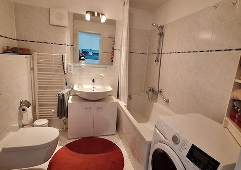 Das Bad ist geräumig und voll ausgestattet mit Badewanne mit integrierter Dusche , Bidet, WC, Waschtisch, Handtuchheizkörper und bietet Platz für eine Waschmaschine (Anschluß vorhanden).