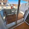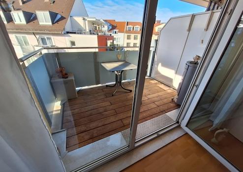 Vom Balkon hat man einen freien Blick in einen sonnendurchfluteten und offenen Innenhof mit Baumbestand und freier Grünfläche. Der Balkon ist durch seinen Lärchenvollholzboden die optische Erweiterung des Wohnzimmers und bietet mit seinen ca. 2m x 3m wunderbar Platz für Sitz- und Liegeflächen.