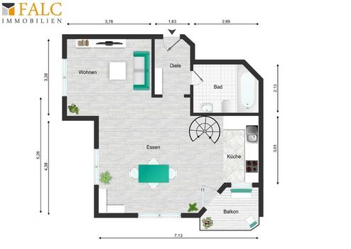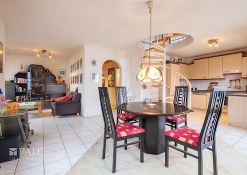 Der offen gestaltete Wohnbereich vereint Wohnzimmer, Essbereich und Küche in einem Raum und bildet den Mittelpunkt des täglichen Lebens. Von hier aus haben Sie Zugang zum West-Balkon, der den Wohnraum nach außen ergänzt. Im Wohnbereich befindet sich zudem die Wendeltreppe, über die Sie die obere Ebene der Wohnung erreichen.